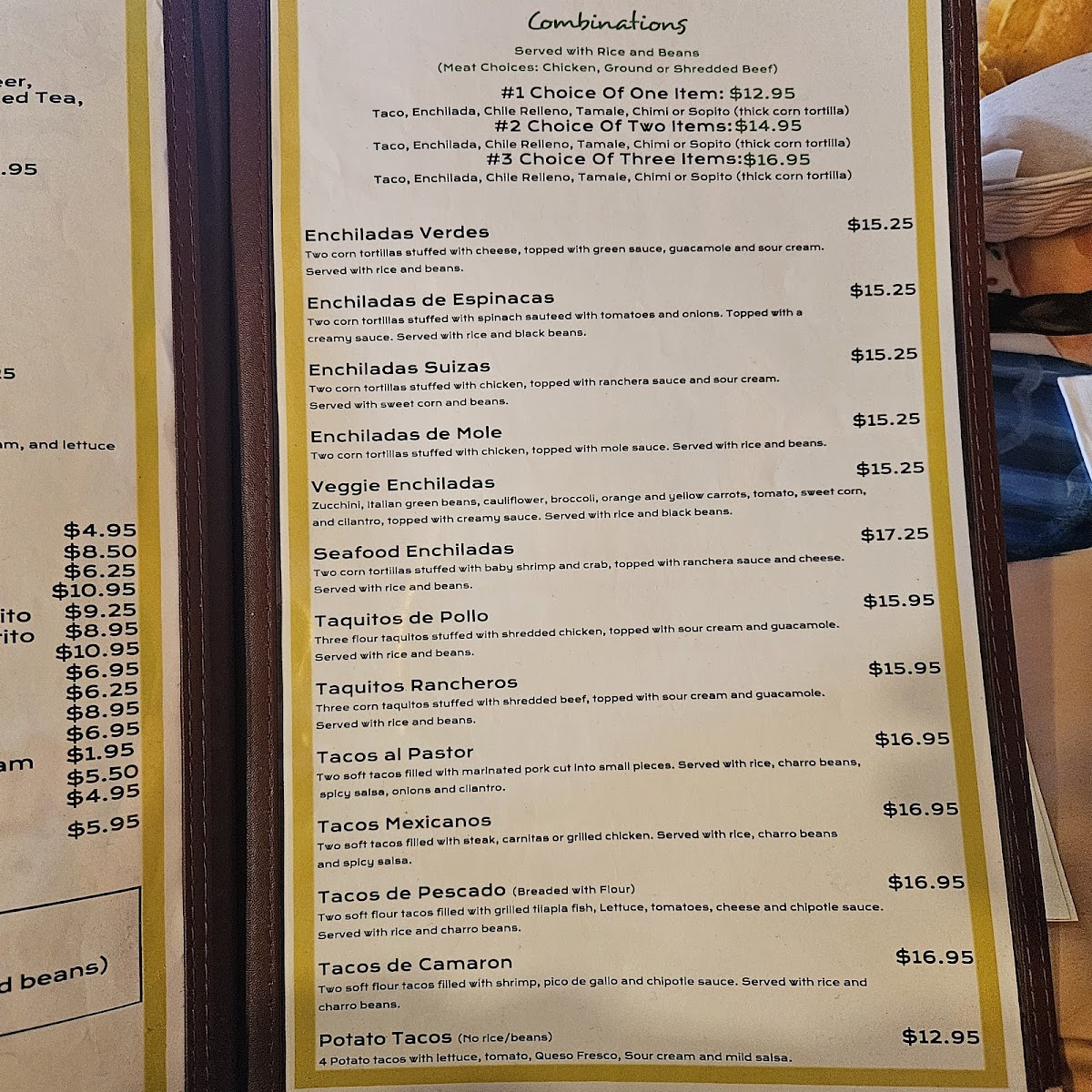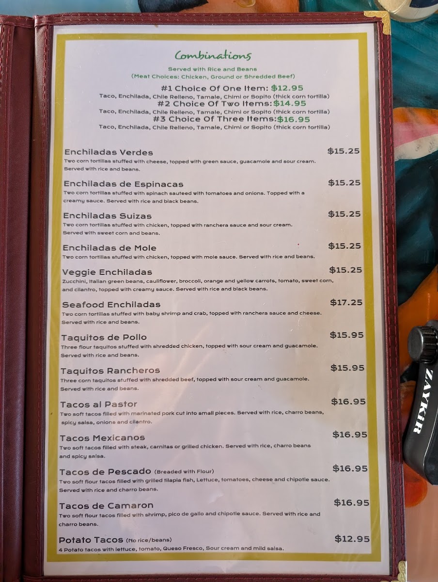 The food menu offers options such as different tacos, burritos, fajitas, enchiladas, and combination plates. There are also selections featuring shredded beef, chicken, shrimp, and steak, accompanied by classic sides like beans and rice. Appetizers such as chips served with various salsas are available as well.