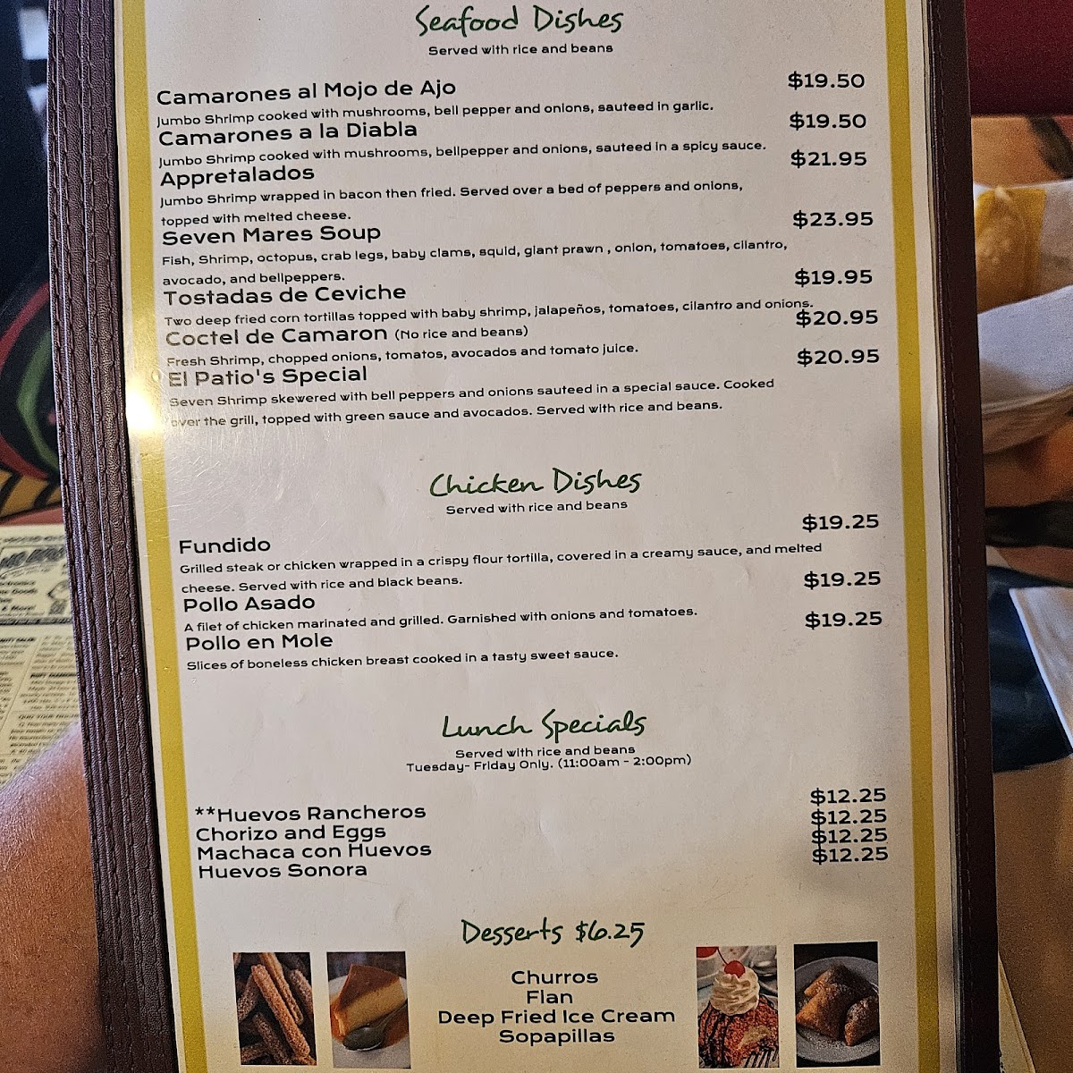 The menu at El Patio Bar & Grill features a variety of Mexican dishes and beverages suitable for casual dining. Visitors can expect a selection that includes appetizers, main courses, and a range of drinks, reflecting traditional and regional Mexican cuisine.
